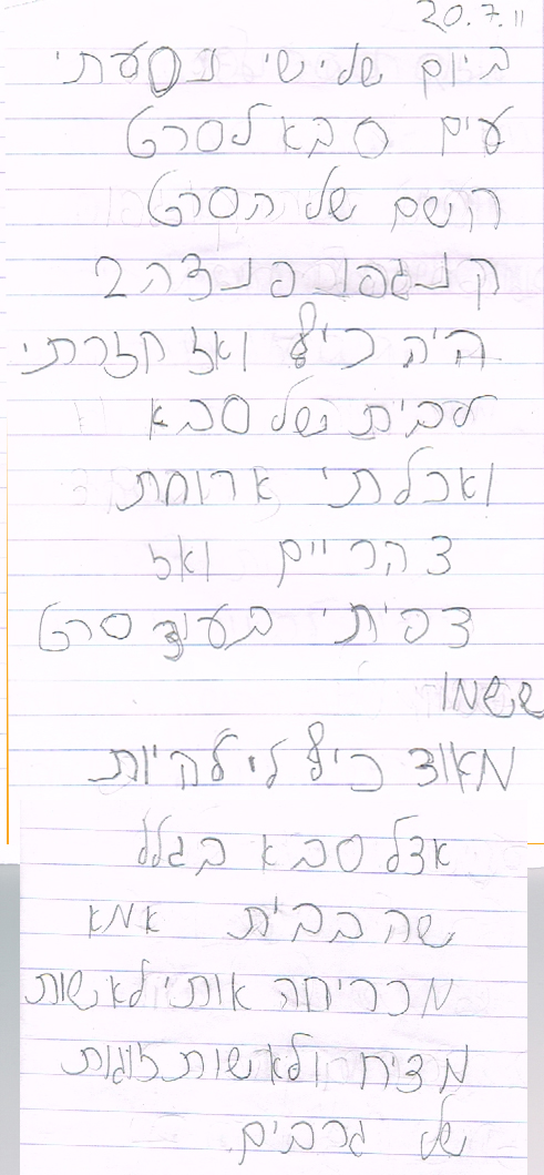 באחת השבתות ישבתי בחוץ וארגנתי את החומר, אורי התיישב לידי ושאל “אמא זה החומר של מגן דוד אדום” הינהנתי שכן ואז הוא ביקש שאקריא את החומר בכל רם, שאלתי אותו למה והוא ענה ברצינות הכל כך מתוקה שלו ואני מצטטת : “אם משיהוא ימות לי בגן….”