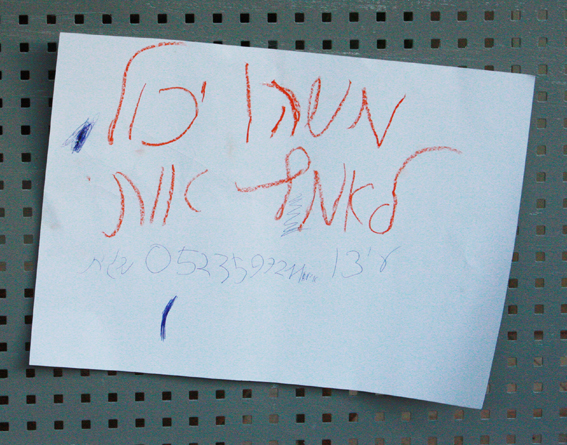 בשבת האחונה 17.9.11 התארחנו לסופ”ש אצל אימי בחדרה, יורם נסע לשחק כדורסל בספורטיאדה באילת אז החלטנו להעביר את השבת מחוץ לבית. סופ”ש השבוע היה רווי ריבים וויכוחים בענייני טלווזיה, מחשב ושעות השימוש בהם (נושא שנידון לעיתים קרובות במחוזותינו) כיוון שאסרתי עליהם לבלות את כל היום מול המסכים, התחילו הריבים ההצקות ההדדיות שבעטיים עידו נכנס לעונשים תכופים באחד מחדרי הבית, הוא כמובן החליט שאני האמא הכי מעצבנת בעולם לקח חתיכת בריסטול כתב ותלה את הנ”ל על השער בחוץ:
